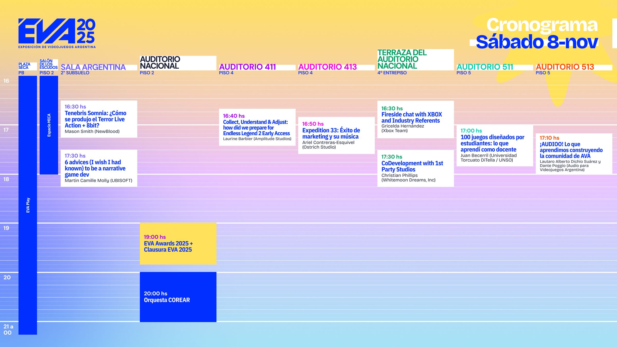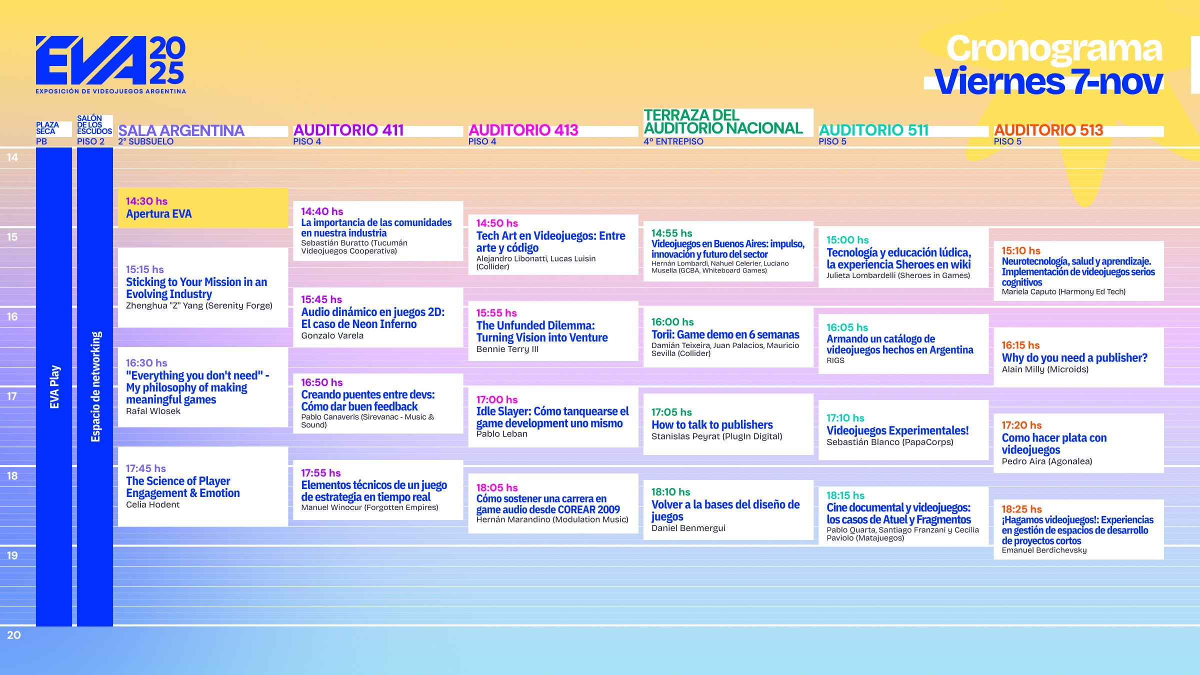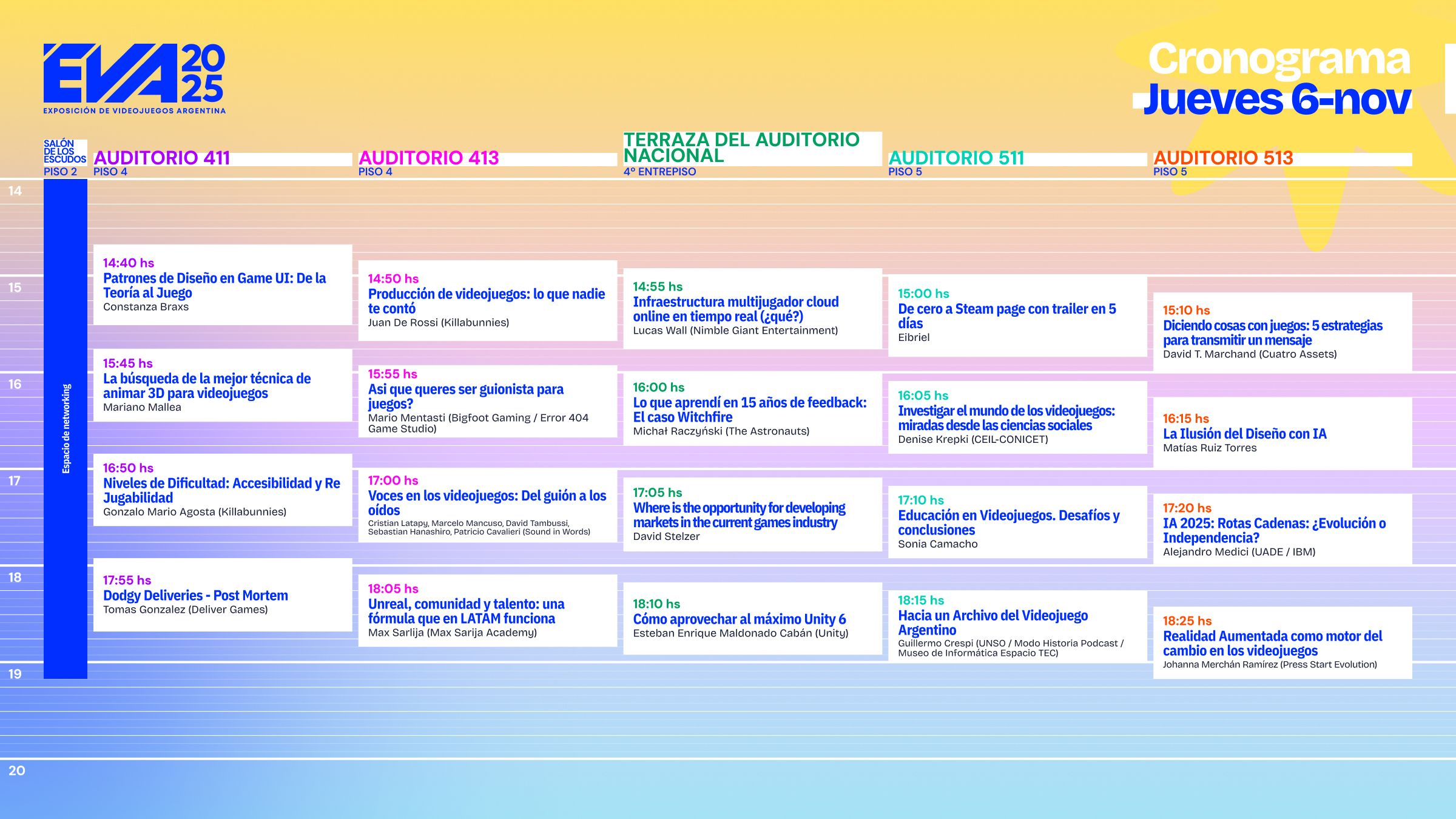The conferences will take place on Thursday, November 6, Friday, November 7, and Saturday, November 8, from 2:00 PM to 8:00 PM at Palacio Libertad, Sarmiento 151, CABA. They will be completely open and free of charge. Arrive early, as seating is limited! We will feature Argentine and international speakers who will share the latest updates on programming, art, industry, business, music, scriptwriting, and design. The full line-up will be announced soon.